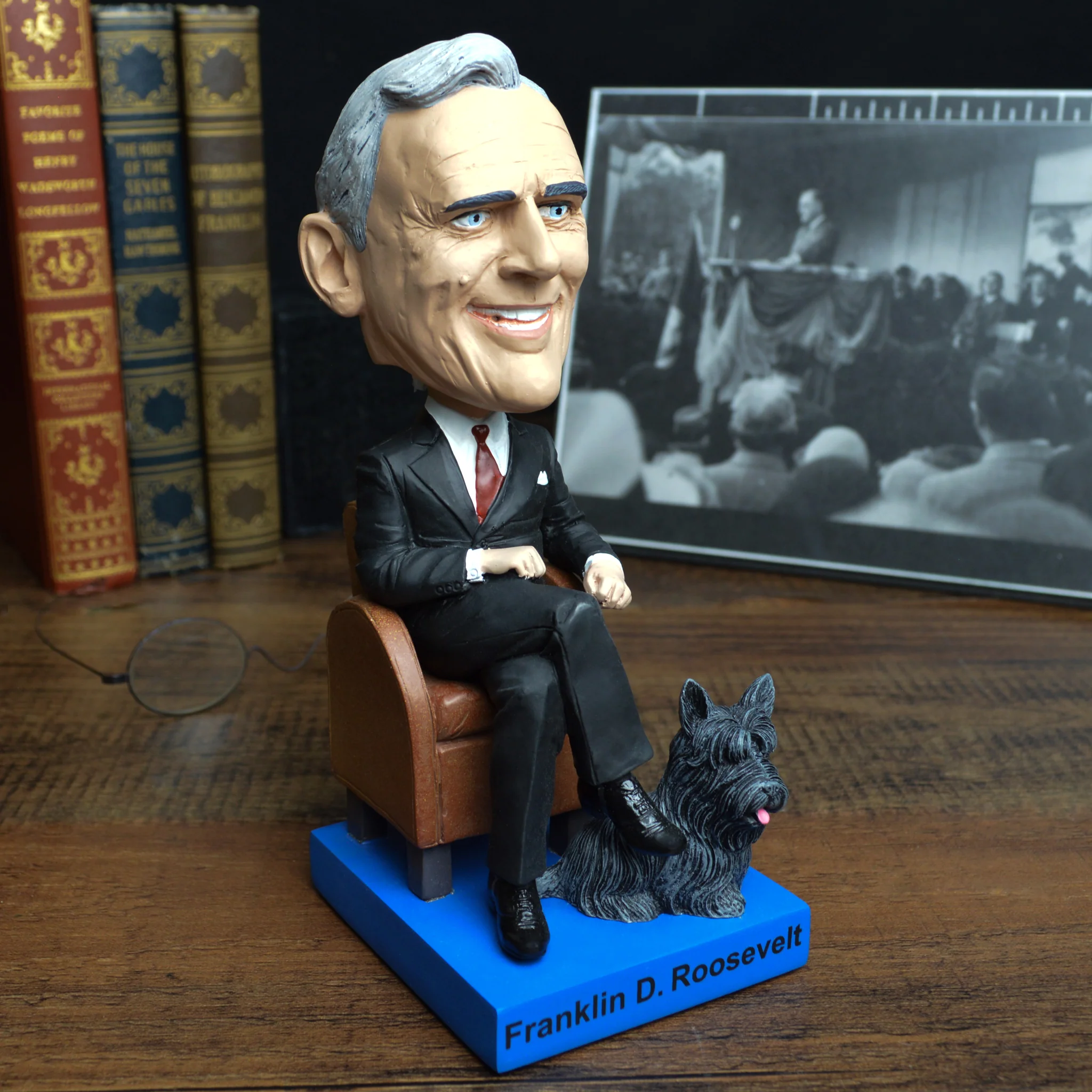 Seated, and with his beloved dog Fala by his side, our Franklin D. Roosevelt Bobblehead is a lifelike portrayal of the 32nd president. Elected four times and leading the country through times of great adversity, FDR instituted sweeping economic reforms, calling them the “New Deal”. His bobblehead agrees, he was a pretty big deal.