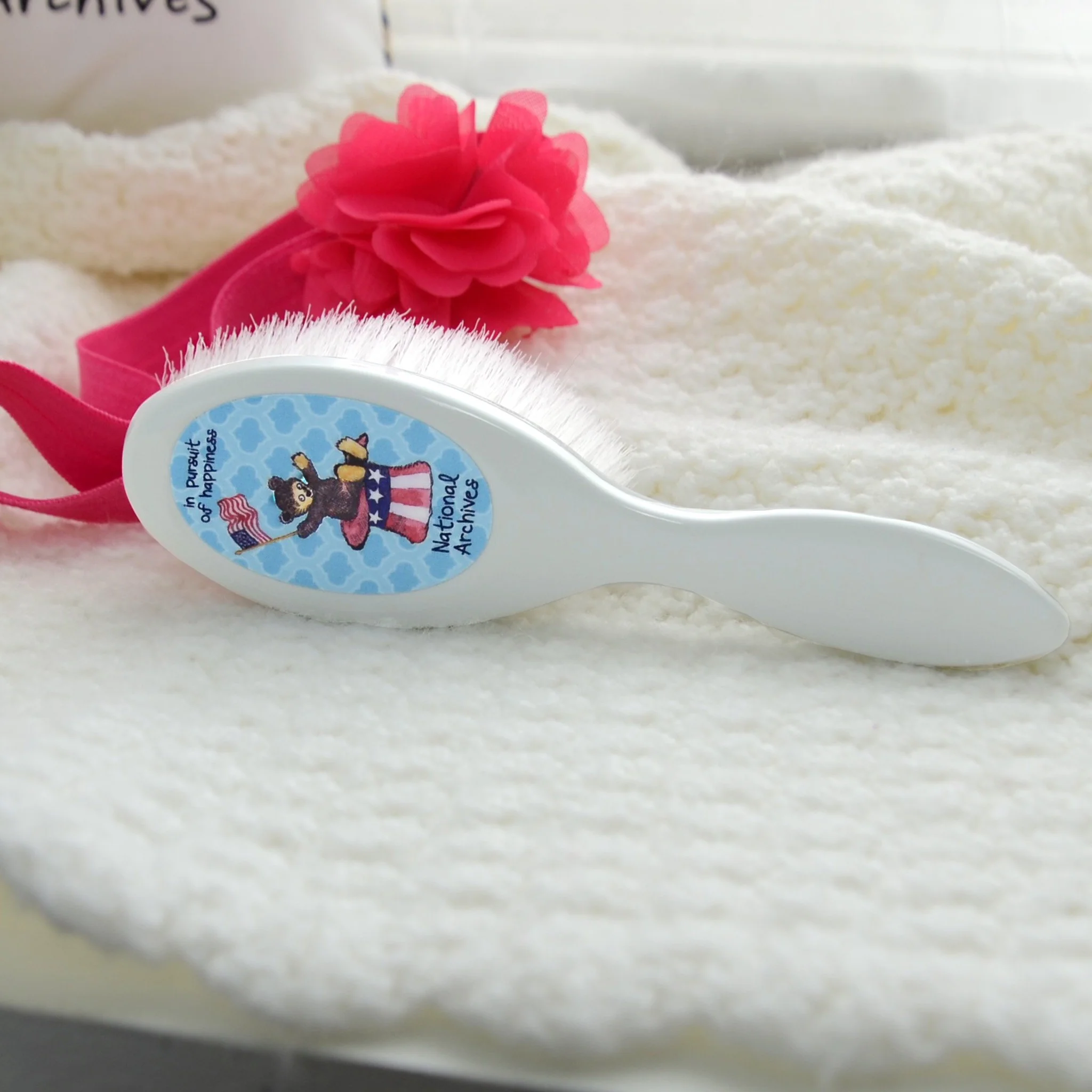 Soft fibers that are gentle on baby’s scalp make this brush a lovely gift for the newest arrival. The cute teddy character waves the red, white, and blue and reminds us of every American's inalienable rights.