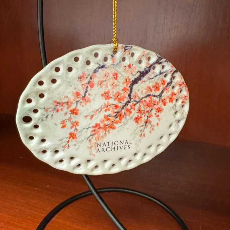 Perfect for displaying all year round, our beautiful cherry blossom artwork is printed in soft tones of pink and orange on this ceramic ornament. A pretty reminder of spring and the cherry blossoms of Washington, D.C., it makes a cheery addition to any space.
