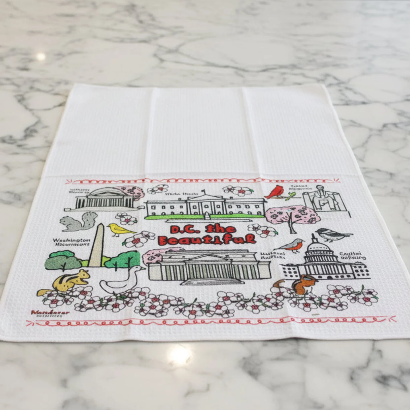 - Celebrate the spring season and the beauty of the nation's capital with our original "D.C. the Beautiful" dish towel, featuring Washington, D.C.'s most iconic landmarks alongside the animals that share its urban landscape. Blending history and nature in a lively, artistic style, this dish towel brings charm and character to the kitchen. Both practical and decorative, it offers a thoughtful way to celebrate the spirit of the nation's capital in everyday moments.