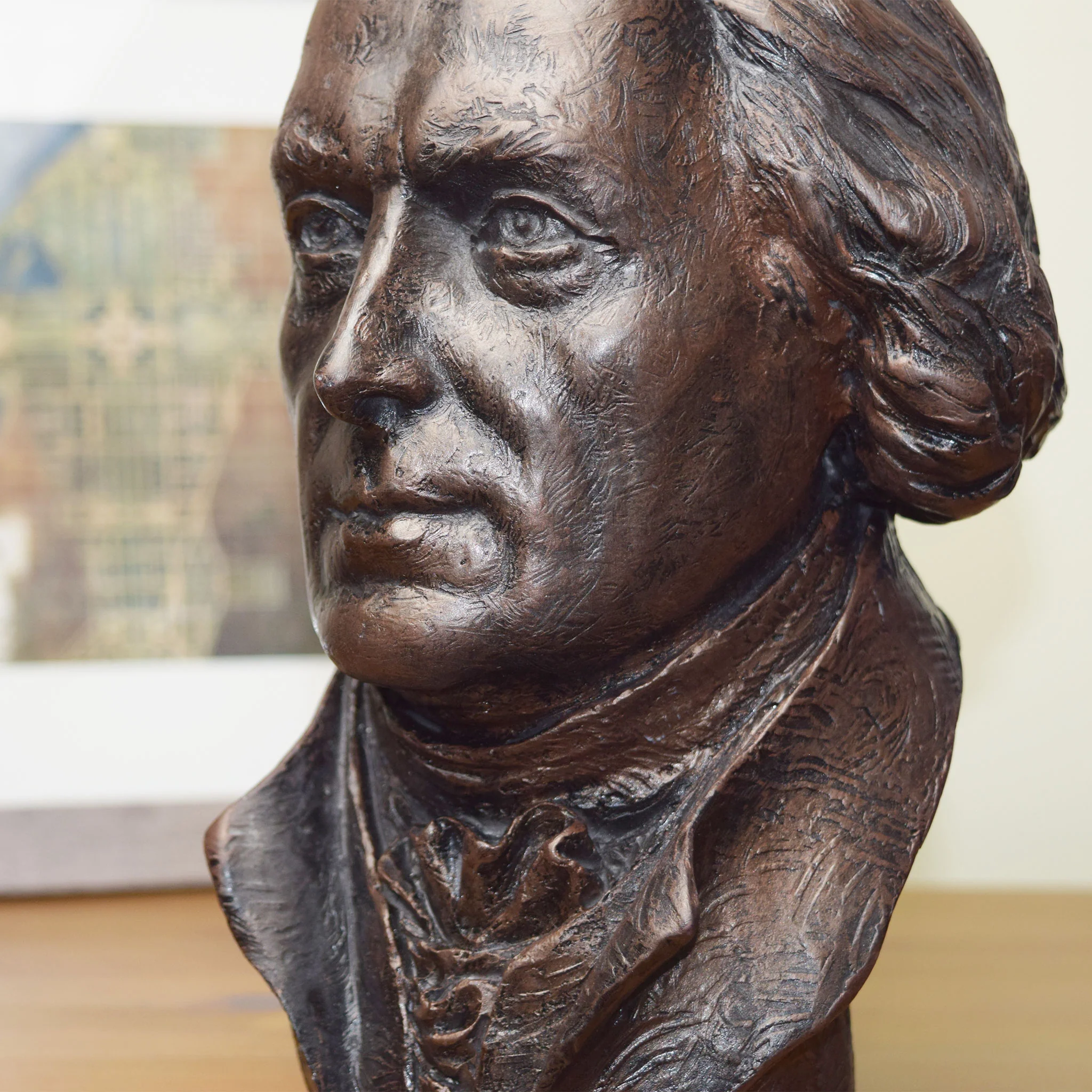This bust of a young James Madison's stately countenance will be a refined accent to an office or bookshelf. Standing a statuesque 11 inches tall, the facial characteristics and fine details of the fourth President of the United States have been cast into bonded marble and hand finished with a bronze tone. This handsome commemorative piece makes a great gift with which to decorate a home, office, or library.