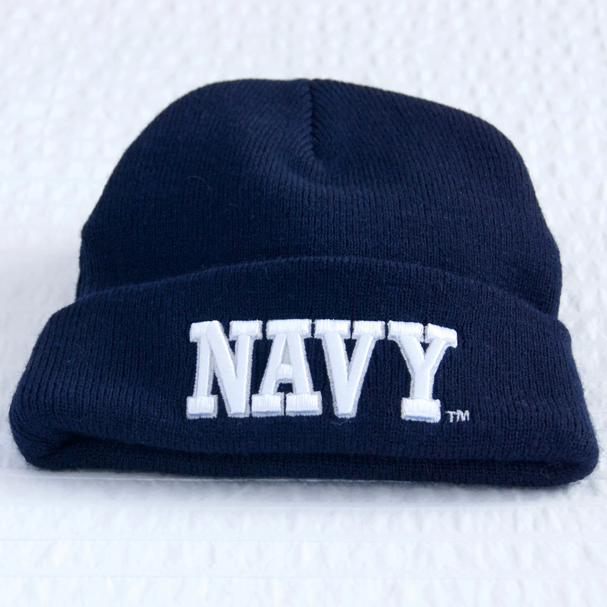 Bundle up in patriotic style with this navy blue roll hem beanie. An adjustable cuff allows the wearer to customize the cap for comfort in chilly weather.