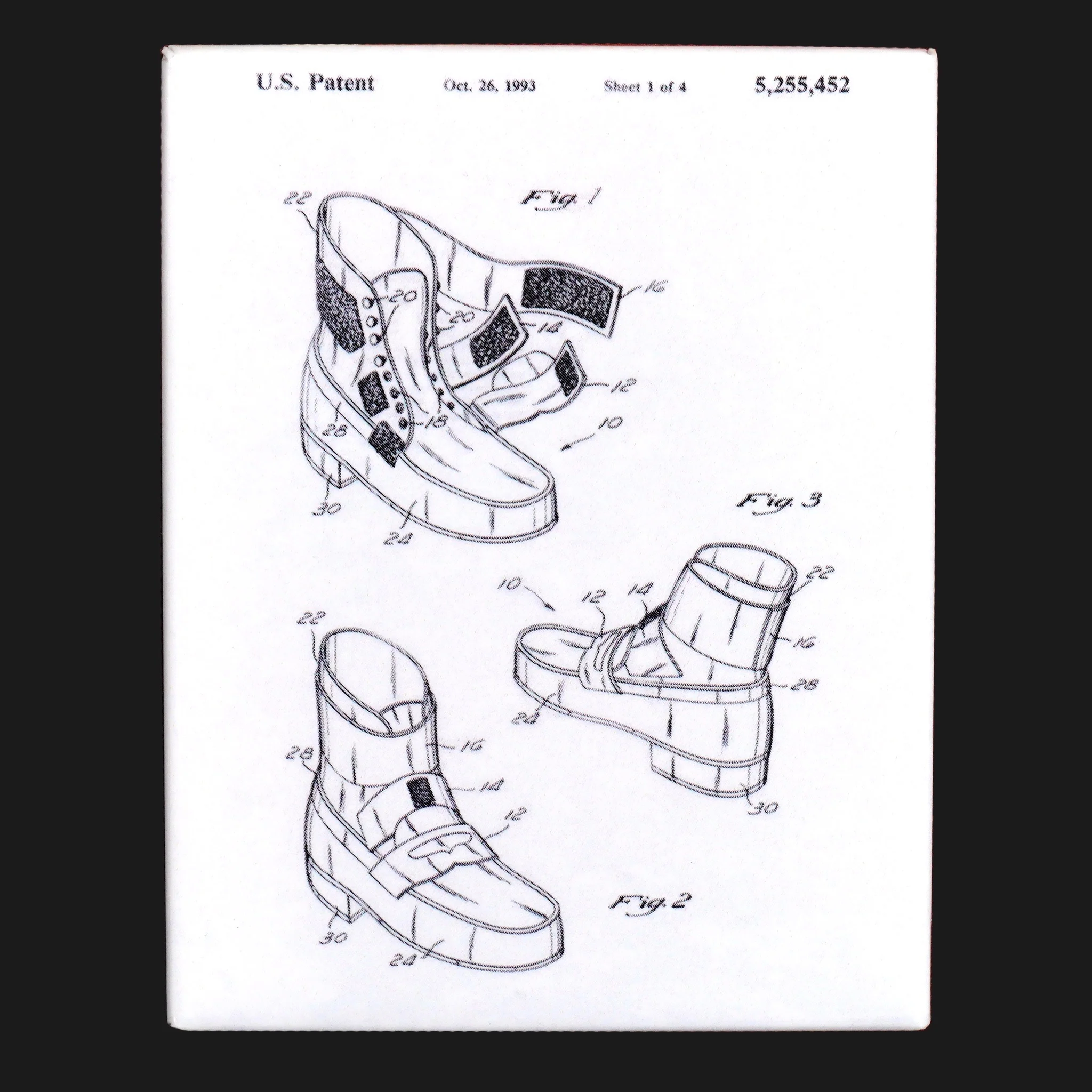 In 1992, “King of Pop” Michael Jackson together with two other inventors, filed US patent number 5255452A for footwear that created an “anti gravity illusion”. The shoe system allowed the wearer to lean forward beyond their center of gravity while wearing specially designed shoes, the heels of which engaged with the surface of a stage. This set of three magnets depict Jackson’s design patent and make a fun conversation starter.