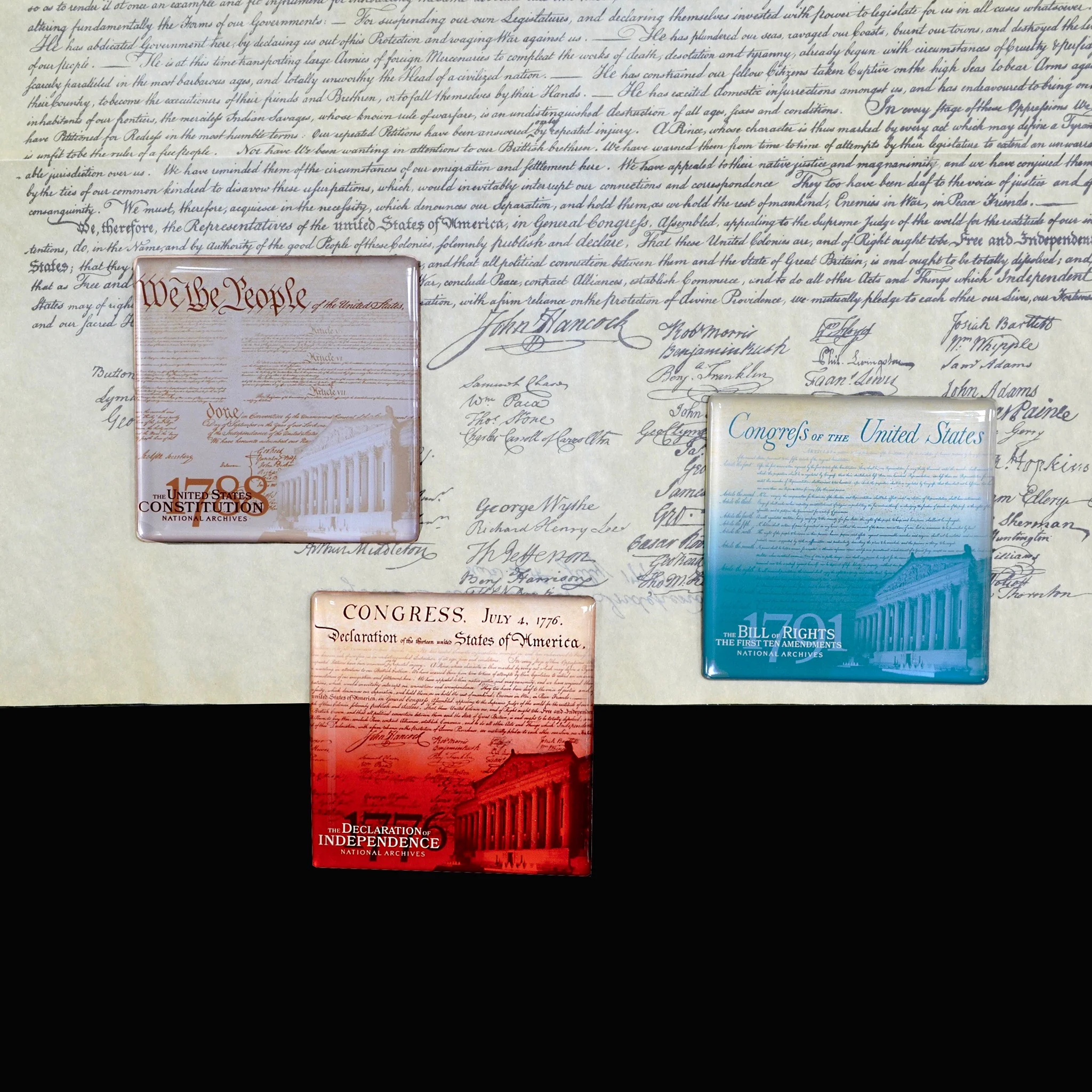 A classic set of magnets for the home or office, each commemorates the Charters of Freedom documents, in the colors that were in popular use at the time of their drafting. The Declaration of Independence , the United States Constitution and Bill of Rights are all on permanent exhibit in the Rotunda at the National Archives Museum.