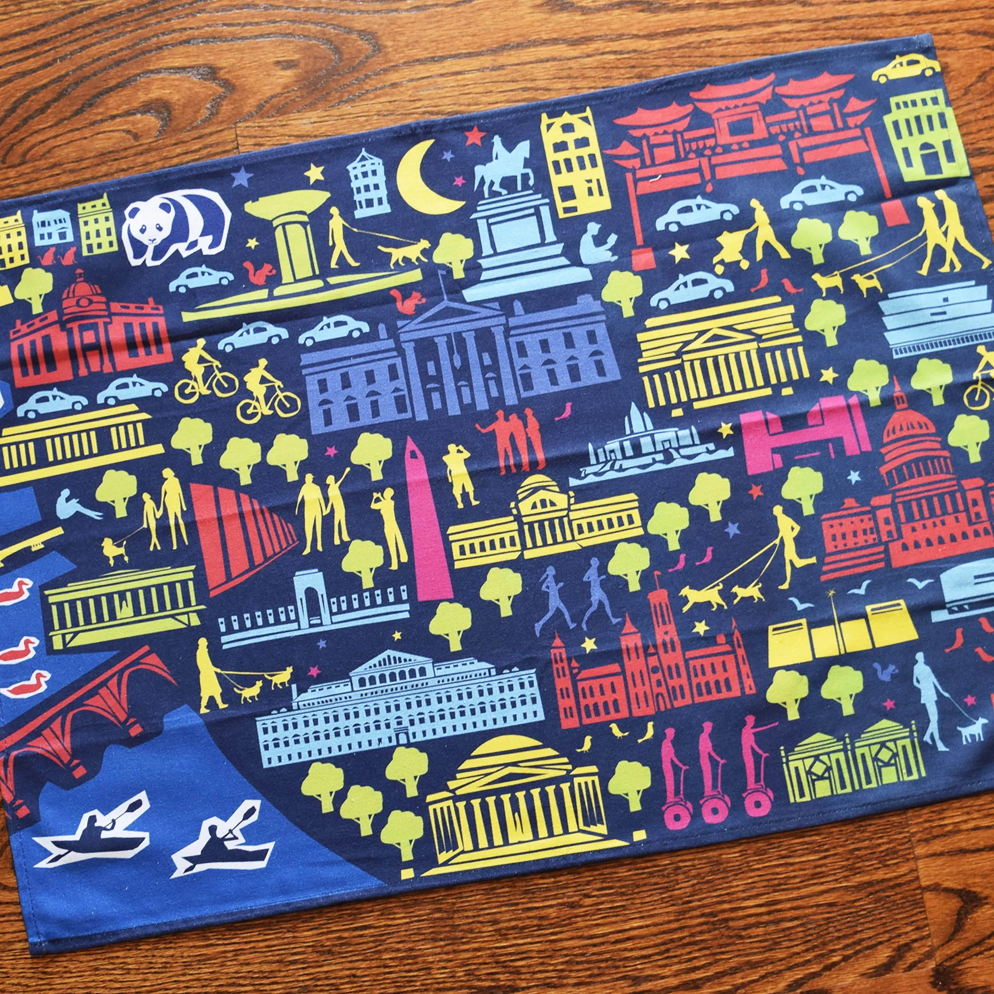 Made of 100% cotton, this screen-printed tea towel depicts the sights of our nation’s capital, in the light of night. A wonderful souvenir of Washington D.C., and its famous buildings and landmarks, this towel’s bold colors make it a bright addition to the kitchen or bar.