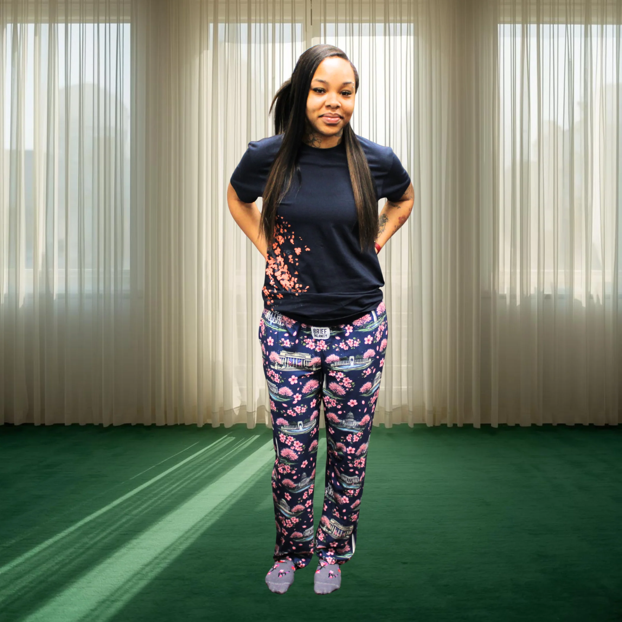 Designed for comfort and ease, these cherry blossom lounge pants offer a soft, relaxed fit perfect for quiet mornings or unwinding at day's end. The pattern also features some of Washington, D.C.'s most iconic landmarks, including the National Archives, the Washington Monument, and the White House. Set against a deep blue background with pink cherry blossoms, these lounge pants are the perfect wearable tribute to the nation's capital.