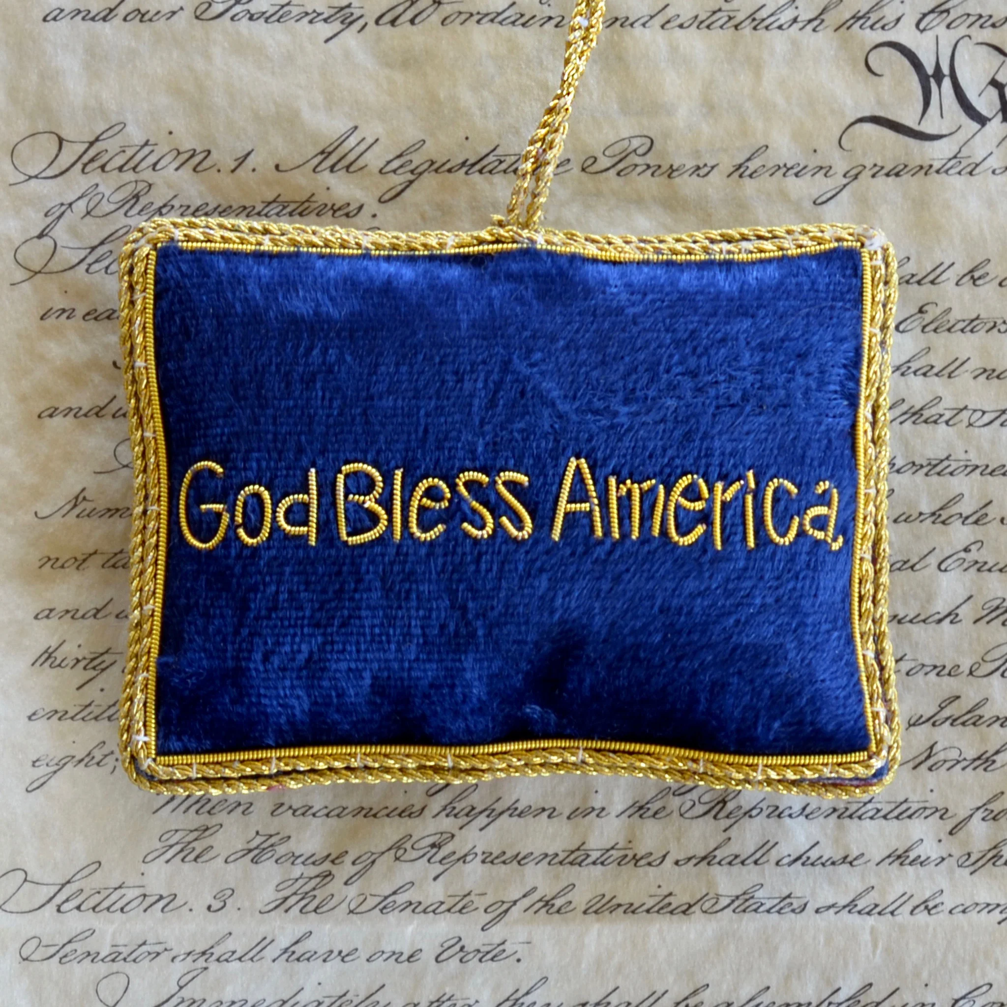 This double sided velvet ornament will take pride of place. With the star spangled banner on one side and God Bless America on the other, it is the perfect addition to a patriotic collection.