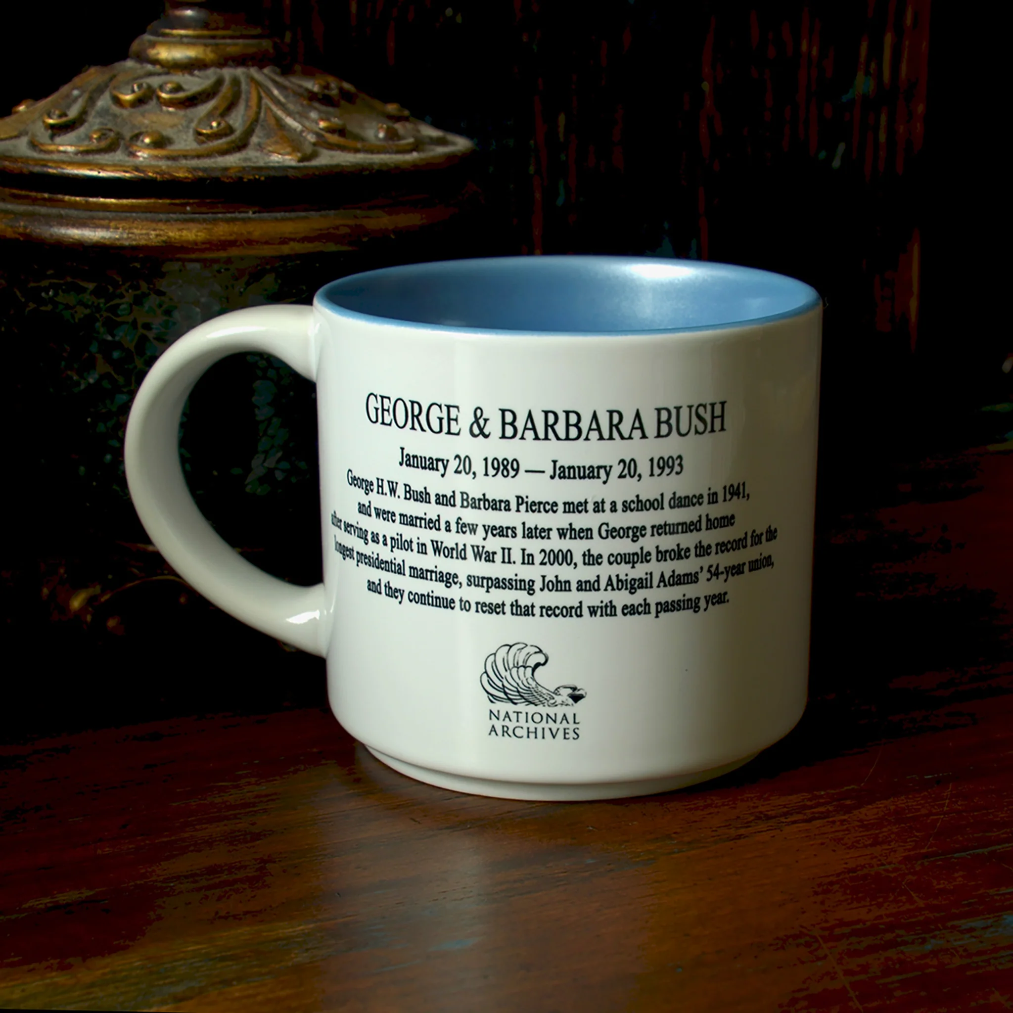 Exclusive to the National Archives, this two-tone ceramic mug commemorates the extraordinary long marriage and partnership of George H. W. Bush and Barbara Pierce. Generously proportioned for hot beverages, this is a fun mug that pays tribute to one of our country’s favorite first couples.