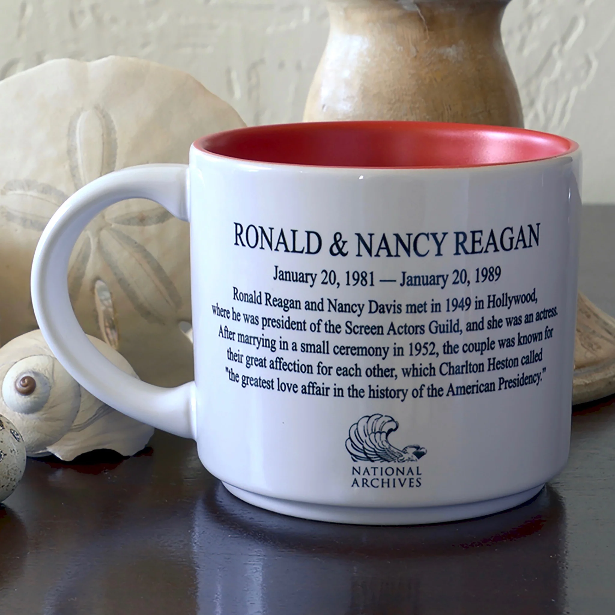 Exclusive to the National Archives, this two-tone ceramic mug commemorates the marriage and partnership of Ronald Reagan and Nancy Davis. Generously proportioned for hot beverages, this is a fun mug that pays tribute to one of our country’s favorite first couples.